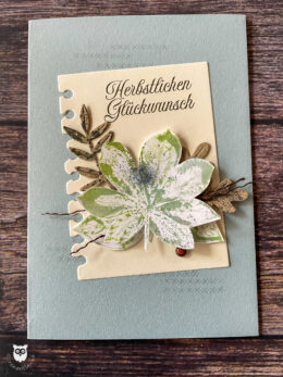 Nach einem kleinen Arbeitseinsatz bei Töchterchen, waren wir Donnerstag spät am Abend wieder zurück daheim. Nur gut, dass ich für meine Wochenendkurse alle schon vorbereitet hatte. Heute sind wir im Kurs herbstlich unterwegs gewesen. Zwei Techniken durften meine Gäste ausprobieren: falsche Aquarell-Technik und Papier altern. Was würde sich besser dafür eignen als herbstliches Laub. Es…